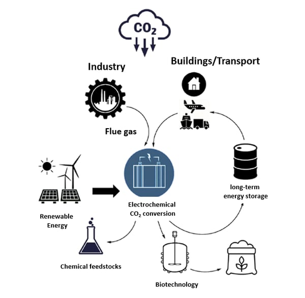 Electrochemical CO2 utilization can also be a possible solution for storing fluctuating renewable energies. Surplus wind or solar energy that cannot be fed directly into the power grid and used could be converted electrochemically into methanol, for example.