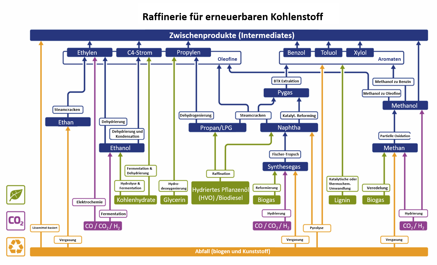 Die erneuerbaren Kohlenstoffquellen bringen auch andere Rohstoffe ins Spiel, die neue Strukturen in der Chemieindustrie fördern. Zu diesen Rohstoffen und Energieträgern zählen CO2, aber auch Wasserstoff, Ethanol und vor allem Methanol, Zucker, Cellulose, Pflanzenöle sowie Altfette und -öle und chemischem Recycling.